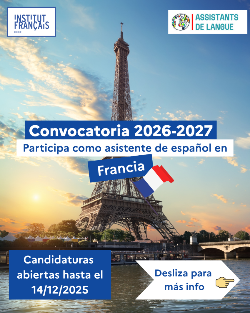 Le Service linguistique de l’Institut Français du Chili ouvre l’appel à candidatures pour le Programme d’assistants de langue espagnole en France. Les étudiants et jeunes professionnels chiliens intéressés peuvent postuler jusqu’au 14 décembre 2025 pour vivre une expérience immersive dans le système éducatif français.